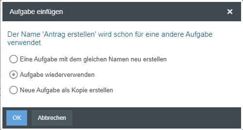 Existiert allerdings bereits eine Aufgabe mit dem gleichen Namen, gibt Ihnen das System verschiedene Möglichkeiten mit dieser Namensdoppelung umzugehen: