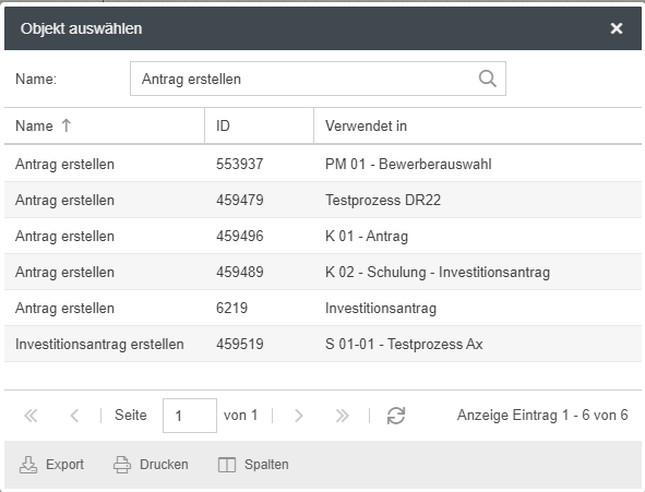 Wiederverwenden | Das gefundene Objekt mit dem gleichen Namen wird in das Prozessmodell als Verlinkung eingefügt. Es handelt sich also um ein und dasselbe Objekt mit der gleichen ID, das in mehreren Prozessen verwendet wird. Dieses ist also mit dem anderen gleichnamigen Objekt verknüpft und hat alle Eigenschaften davon übernommen. Wird ein Objekt in einem beliebigen Prozess bearbeitet, wirkt sich diese Änderung auch in allen anderen Prozessen aus, in denen das Objekt wiederverwendet wurde. Wenn bereits mehrere Objekte einer Art mit dem gleichen Namen erstellt wurden, öffnet sich nach der Auswahl von 'Wiederverwenden' eine Liste mit all diesen Objekten, aus denen das gewünschte zur Wiederverwendung ausgewählt werden kann. ![]() |