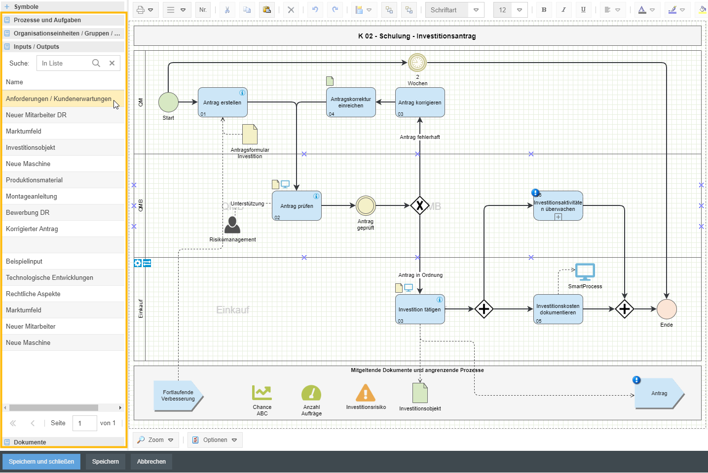 Im Symbolbereich des Prozessdesigners stehen neben den Modellierungssymbolen weitere Reiter zur Verfügung. Dazu gehören: