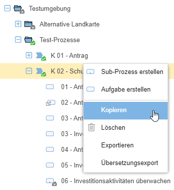 Im Prozess-Explorer lassen sich mit einem Rechtsklick und dem Button <Kopieren> Prozessgruppen, Prozesse, Sub-Prozesse und Aufgaben wiederverwenden oder kopieren.