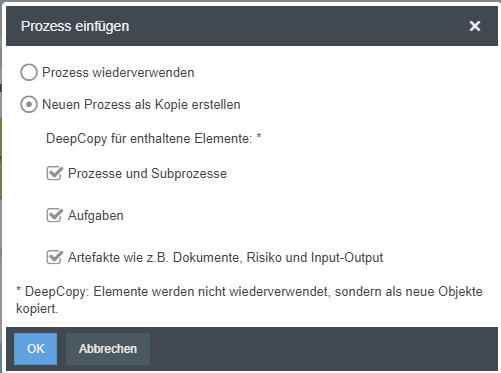 Wird <Prozess wiederverwenden> ausgewählt, wird der Prozess und alle darin enthaltenen Sub-Prozesse, Aufgaben und Artefakte an die neue Position verlinkt, sodass alle Objekte die gleiche ID haben, wie in dem ursprünglichen Prozess.