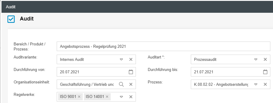 Wenn ein neuer Audit-Vorgang erstellt wird, öffnet sich zunächst das Hauptformular, in dem die Stammdaten zu dem geplanten Audit festgehalten werden. Der Screenshot zeigt einen Ausschnitt des Hauptformulars.