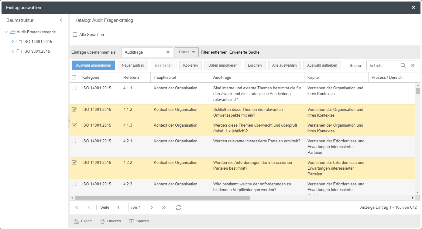 In dem sich öffnenden Fenster können Sie bei Bedarf anhand der vordefinierten Kategorien oder der "Suche in Liste" eine Filterung vornehmen und eine oder mehrere Fragen per <Auswahl übernehmen> aus dem Katalog zu dem Audit-Vorgang hinzufügen.