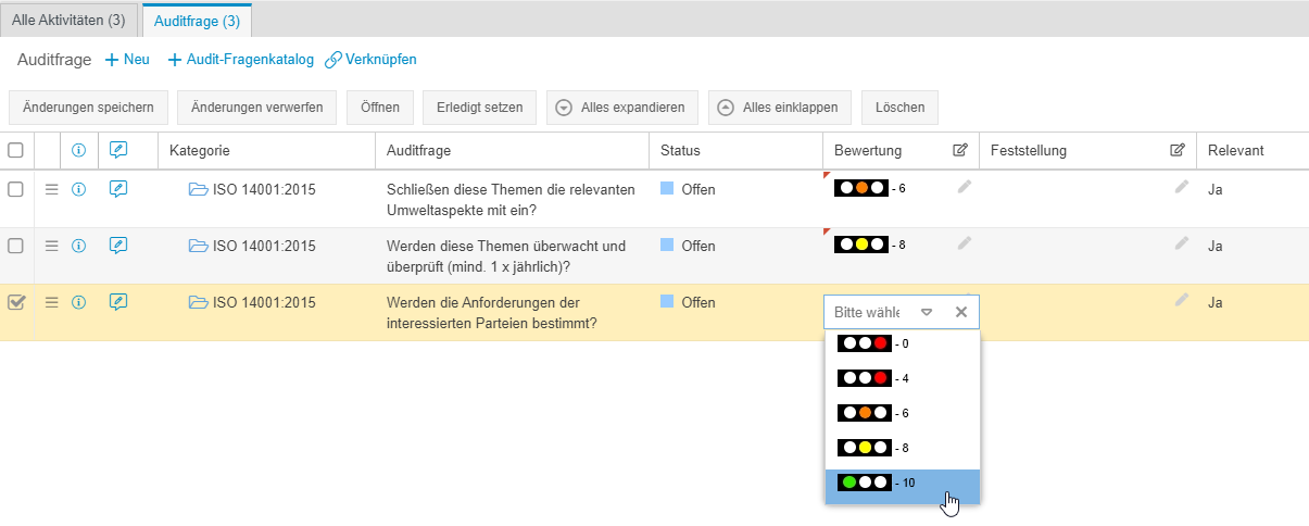 Die Bewertung der Auditfragen kann direkt über das entsprechende Feld in der Aktivitätenliste erfolgen. Wählen Sie die Bewertung aus und bestätigen diese mit einem Klick auf <Änderungen speichern>.