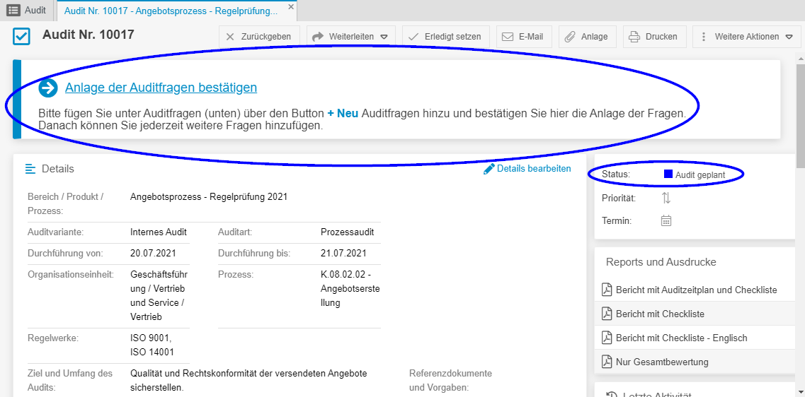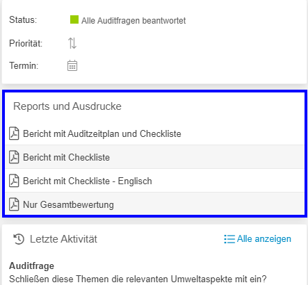 Diese enthalten neben den Stammdaten des Audits auch eine Auflistung der Auditfragen inklusive deren Bewertung und aktuellem Status.