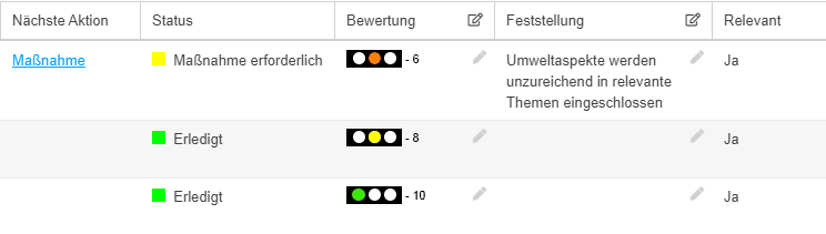 - Bewertung kleiner als 8 -> Relevante Abweichung. Es muss eine Feststellung in das dafür vorgesehene Feld eingetragen und eine Maßnahme zur Verbesserung eingeleitet werden.