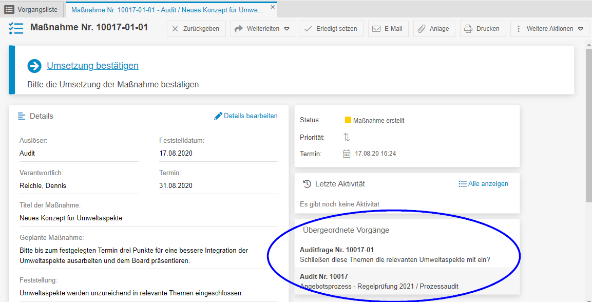 In dem Erstellungsfenster kann unabhängig von der Verantwortlichkeit des Audits eine verantwortliche Person eingetragen werden, welche die Maßnahme zur Umsetzung weitergeleitet bekommt. Der Ablauf der Maßnahme entspricht dabei der Beschreibung im Artikel Maßnahmenmanagement. Im Vorgangsfenster der Maßnahme ist anhand der Box "Übergeordnete Vorgänge" jederzeit der Bezug zu der Auditfrage und dem Audit einsehbar.