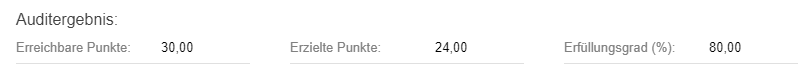 Jede Frage kann mit maximal 10 Punkten bewertet werden. Die erreichbaren Punkte errechnen sich daher aus der Anzahl der Auditfragen, bei denen "Relevant" = "Ja" angegeben wurde, mal 10. Die erzielten Punkte stellen die Summe der Bewertungspunkte aller relevanten Auditfragen dar. Der Erfüllungsgrad berechnet sich als Quotient aus erzielten Punkte und erreichbaren Punkten.