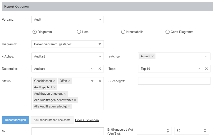 Um diese zu verändern oder eigene Reports zu erstellen, gehen Sie anhand der Beschreibung im Artikel Reporting für Vorgänge vor. Für die Filterung der Vorgänge stehen Ihnen dabei immer die Felder aus dem jeweiligen Workflow zu Verfügung - in diesem Fall also die Felder aus dem Hauptformular des Audits.