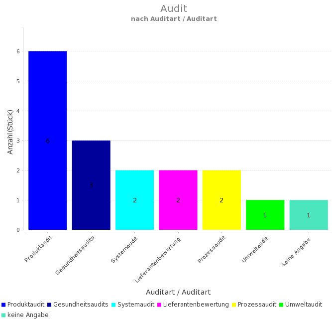 Das folgende Anschauungsbeispiel zeigt die Konfiguration und Ergebnisansicht eines grafischen Reports, bei dem alle Audits mit einem Erfüllungsgrad von weniger als 80 % nach der Auditart kategorisiert aufgelistet werden. Anhand dieser Auswertung kann erkannt werden, in welchen Unternehmensbereichen bei Audits besonders häufig starke Abweichungen festgestellt werden.