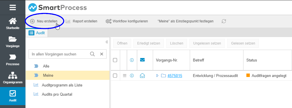 - Über das Menü Vorgänge -> Neu erstellen -> Audit
