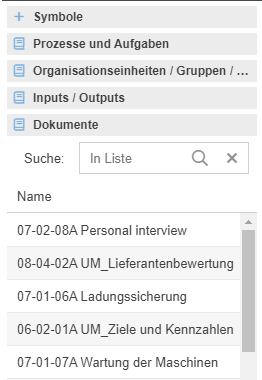 - In den Details eines Prozesses unterhalb vom Prozessmodell sind alle verknüpften Dokumente in der Liste 'Dokumente' aufgelistet