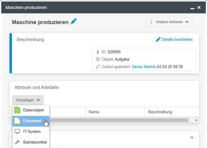- Das Dokument wurde direkt über die Tabelle 'Artefakte' in den Eigenschaften einer Aufgabe verknüpft (siehe Beschreibung oben)