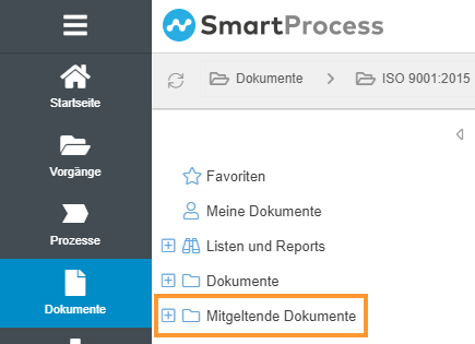 Um das Dokument zusätzlich in einen beliebigen Unterordner des Ordners 'Dokumente' einzuordnen, kann der entsprechende Ordner geöffnet werden (im Beispiel ISO 9001:2015).
