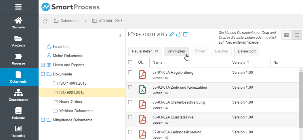 - Über <Verknüpfen> kann auf bereits erstellte Dokumente in SmartProcess zurückgegriffen und diese dem Dokumentenordner hinzugefügt werden.