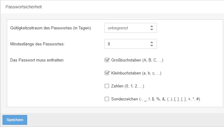 Des Weiteren können Sie Mindestanforderungen festlegen, die Benutzer bei Änderung Ihres Passworts einhalten müssen. Dazu zählt die Mindestlänge des Passworts sowie die Auswahl, ob es mindestens einen Großbuchstaben, Kleinbuchstaben, eine Zahl oder ein Sonderzeichen enthalten muss.