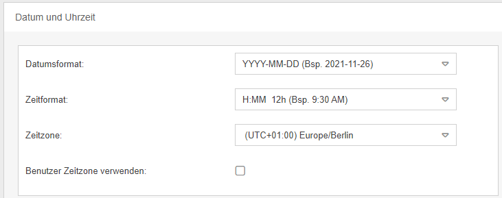 Mit diesen Einstellungen kann das Anzeigeformat für Daten und Zeitangaben angepasst werden und darüber hinaus auch die berücksichtigte Zeitzone.