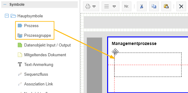 Im linken Bildschirmbereich finden Sie die Symbolleiste. Wählen Sie dort entweder das Objekt Prozessgruppe oder Prozess und legen es per Drag & Drop im Arbeitsbereich des Prozessmodells ab.
