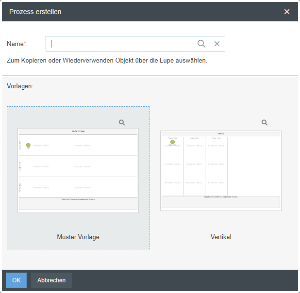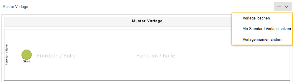 Sie können für neue Objekte eine zuvor gespeicherte Vorlage nutzen, bei der z. B. die Farbgebung berücksichtigt wird und bei Prozessen zusätzlich die Anzahl der Swimlanes. Die Vorlage selber kann im Prozessdesigner gestaltet und unter "Weitere Aktionen" gespeichert werden.