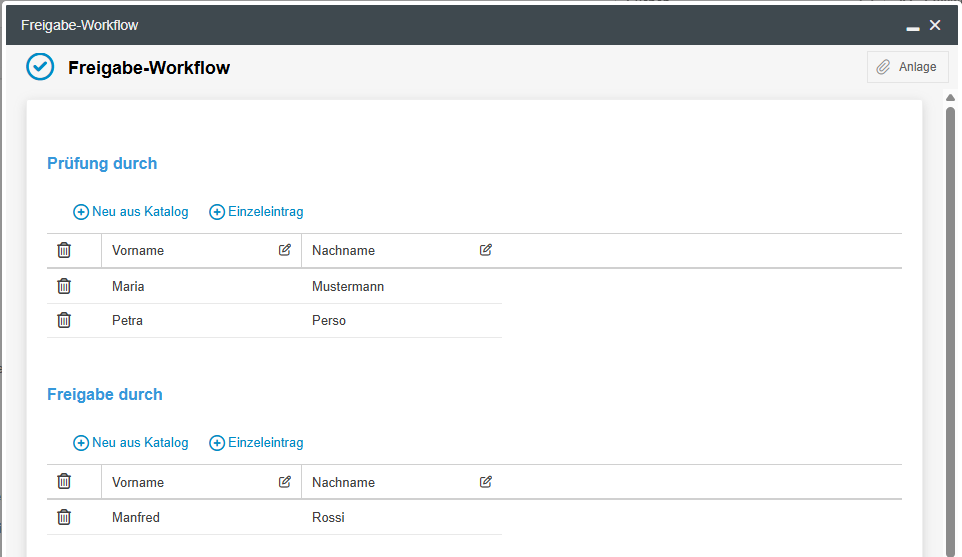 Voraussetzung hierfür ist die Version des Freigabe-Workflows, in dem die Prüfenden und Freigebenden in einer Feldgruppe erfasst werden