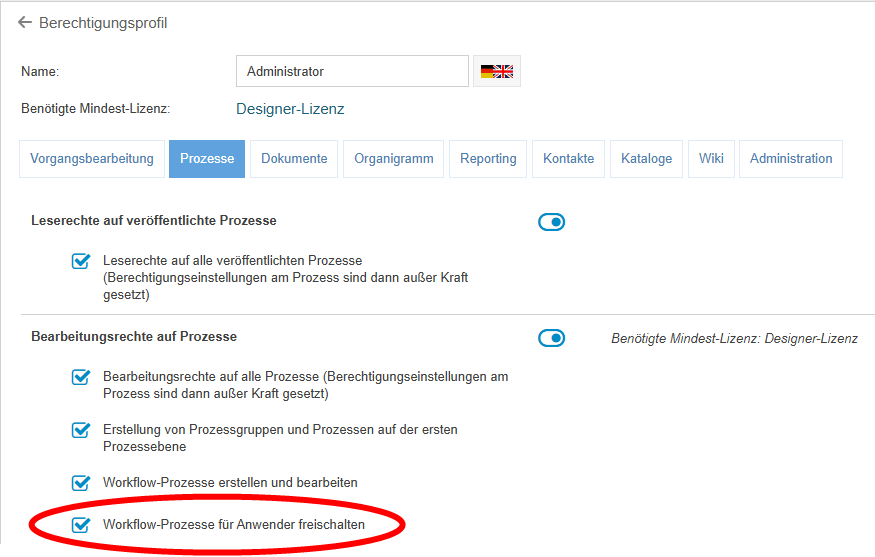 - Im Berechtigungsprofil - Reiter Prozesse gibt es das neue Privileg Workflow-Prozesse für Anwender freischalten. Dieses benötigt man, um einen modellierten Workflow in den Workflow-Einstellungen für Endanwender aktiv / inaktiv zu schalten bzw. die aktiv geschaltete Version zu ändern.
