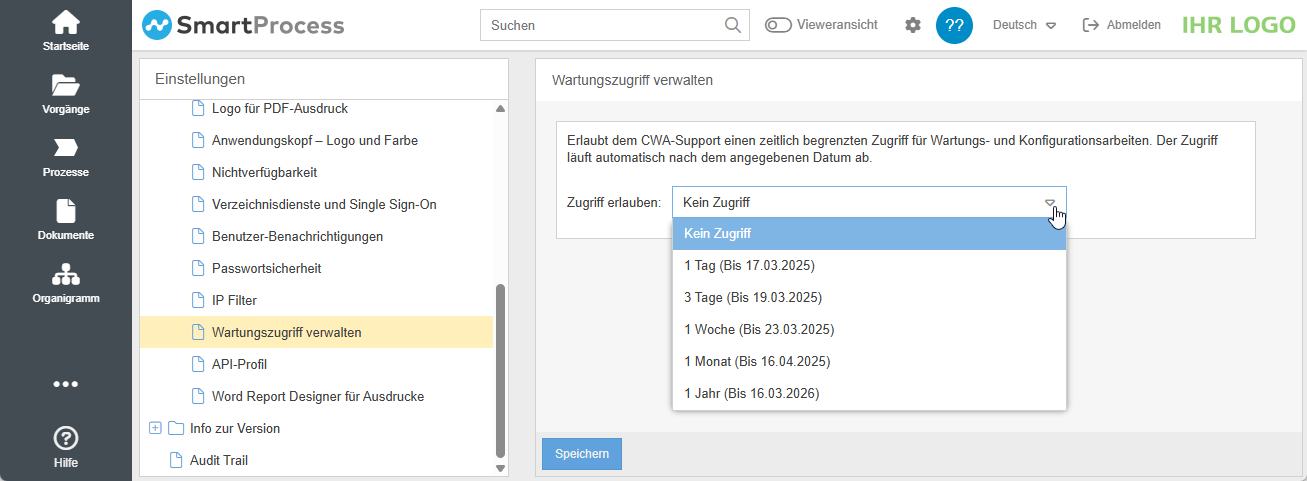 - Verwaltung der Fernwartung durch CWA für SaaS-Systeme. Wenn bei Ihnen eine SaaS-Installation von SmartProcess vorliegt, können Sie unter Einstellungen -> Anwendung konfigurieren über das neue Setting Wartungszugriff verwalten bestimmen, ob und in welchem Zeitrahmen Supportmitarbeiter von CWA mit einem Wartungsuser auf Ihre SmartProcess-Installation zugreifen dürfen.