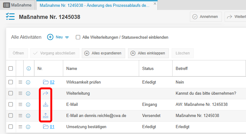 - In der Aktivitätenliste eines Vorgangs werden Weiterleitungen mit Kommentar sowie eingehende und ausgehende E-Mails nun mit einem eigenen Symbol in der Spalte Nr. hervorgehoben.
