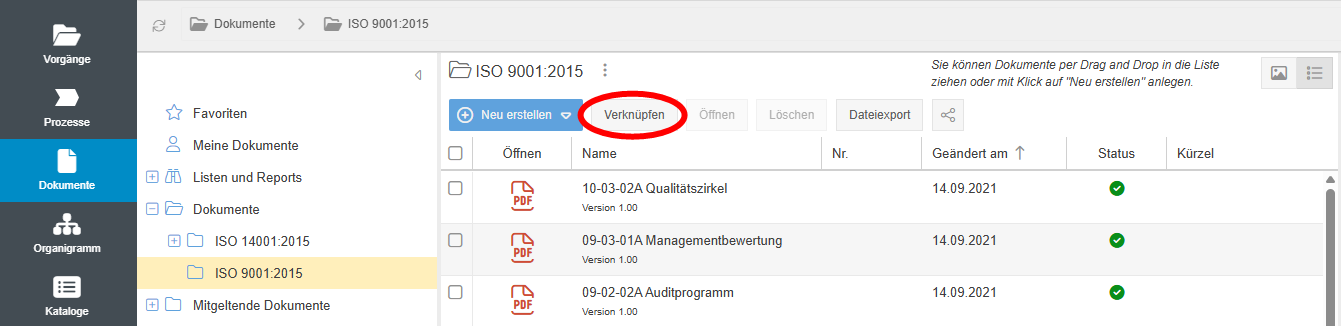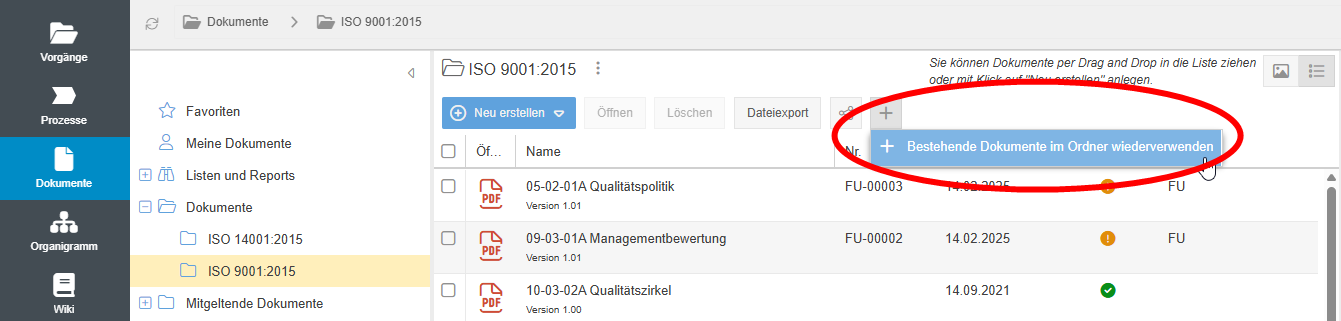 - In der Listenansicht eines Ordners im Menü Dokumente wurde der Button Verknüpfen entfernt, um Dokumente von anderen Speicherorten in dem gerade ausgewähltem Ordner wiederzuverwenden. Diese Funktion verbirgt sich nun hinter dem Button + und anschließendem Klick auf Bestehende Dokumente im Ordner wiederverwenden.
