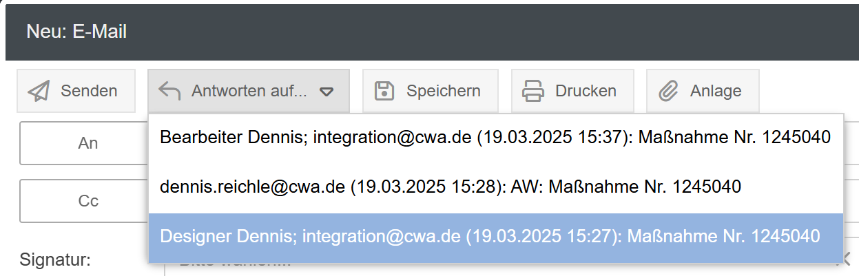 - Beim Verfassen einer E-Mail aus einem Vorgang ist es mit dem Button Antworten auf... nun möglich auf eine vorherige E-Mail des Vorgangs zu antworten. Dabei wird der bisherige Nachrichtenverlauf in das Text-Feld der verfassten E-Mail geladen.