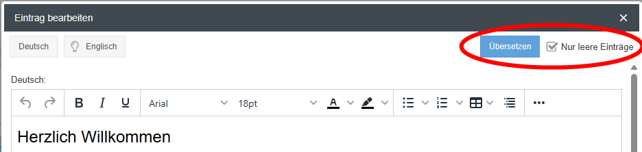 - Bei Nutzung der Funktion Automatische Übersetzung kann mit der neuen Option Nur leere Einträge entschieden werden, dass der zu übersetzende Inhalt nur für die Sprachen erfasst wird, bei denen eine Übersetzung bisher gefehlt hat. Die Checkbox ist default aktiviert. Wird sie vor dem Klick auf den Button Übersetzen deaktiviert, werden beim Übersetzen zusätzlich die Inhalte in den Sprachen, für die bereits eine Übersetzung gepflegt war, überschrieben.