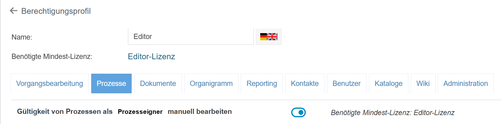 - Die Gültigkeit von Prozessgruppen und Prozessen kann ab jetzt mit einer Editor-Lizenz manuell bearbeitet werden, sofern der Benutzer als Prozesseigner oder Prozessmanager eingetragen ist. Ob diese Möglichkeit aktiviert sein soll oder nicht, kann mit einem neuen Privileg in den Berechtigungsprofilen eingestellt werden.