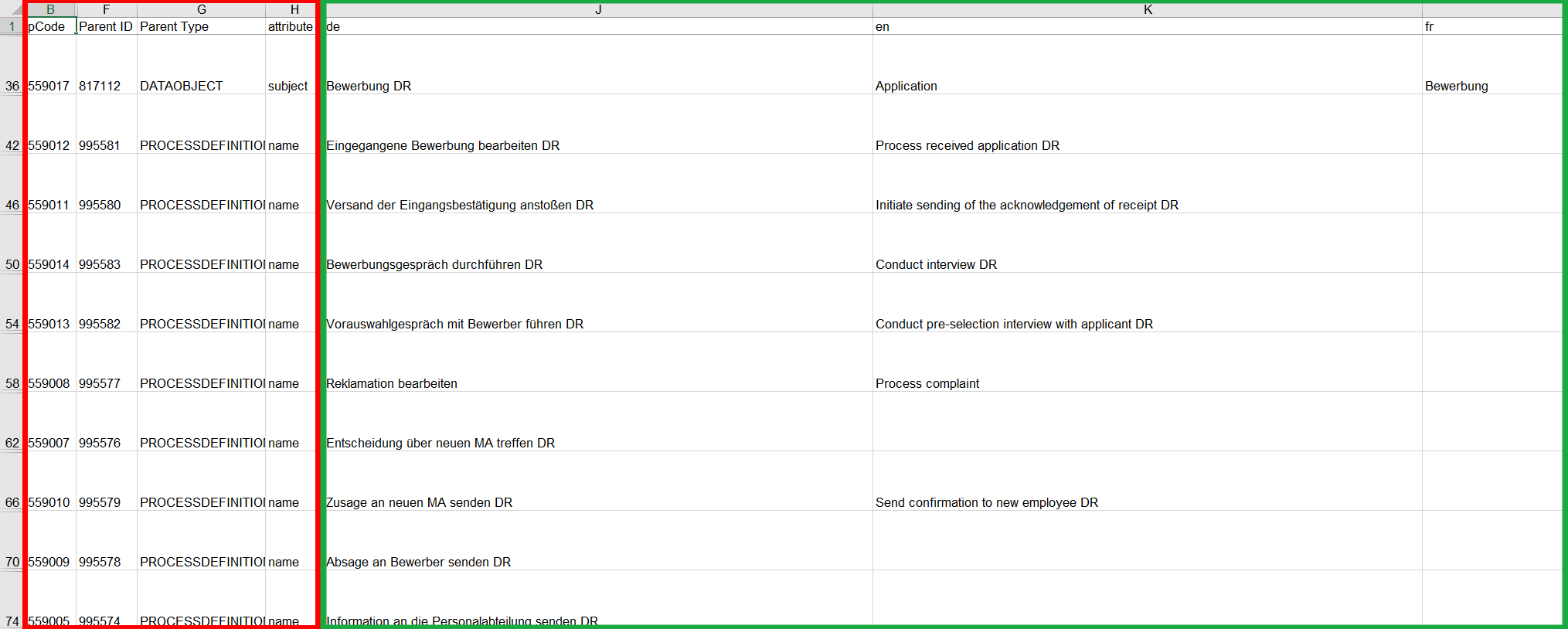 Die ersten 4 Spalten (rot umrahmt) dienen der Zuordnung der Übersetzungen zu den richtigen Objekten beim Import und sollten nicht verändert werden. Des Weiteren wird für jede in SmartProcess aktivierte Sprache eine Spalte angeboten (grün umrahmt), in der die Übersetzungen eingetragen werden können. Nach der Bearbeitung speichern Sie die Datei ab.