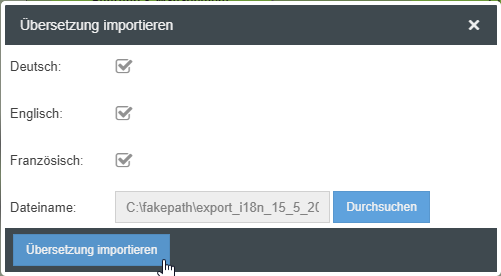Wählen Sie anschließend im Fenster mit dem Button <Durchsuchen> die Excel-Datei mit den Übersetzungen sowie die Sprachen aus, für welche die Übersetzungen importiert werden sollen. Anschließend können Sie den Import mit dem Button <Übersetzung importieren> starten.