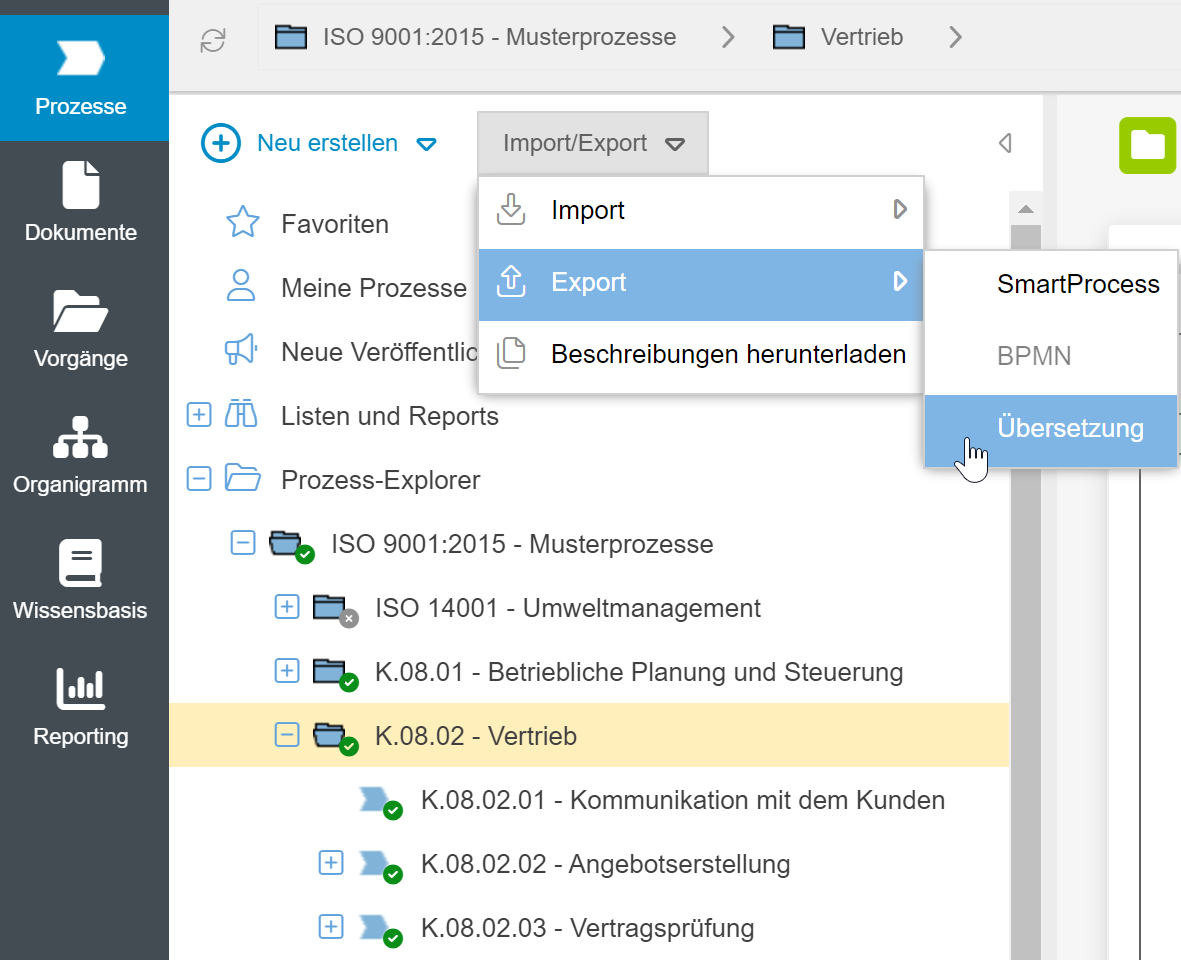 Wird der Übersetzungsexport also für die Prozessgruppe "Vertrieb" durchgeführt, werden auch alle Daten der darunterliegenden Prozesse "Kommunikation mit dem Kunden", "Angebotserstellung" und "Vertragsprüfung" für die Übersetzung mit exportiert. Wird nur der Prozess "Angebotserstellung" ausgewählt, werden nur die Daten dieses Prozesses für die Übersetzung exportiert.