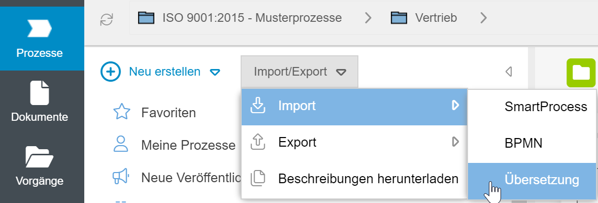 Der Übersetzungsimport erfolgt im Navigationsbereich des Menüs Prozesse über den Pfad Import/Export -> Import -> Übersetzung.