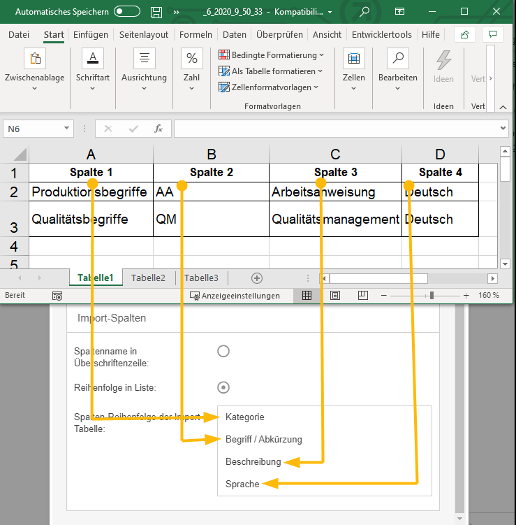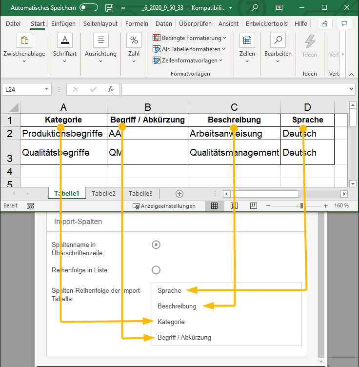 Reihenfolge in Liste | Bei diesem Import-Verhalten wird anhand der Reihenfolge der Spalten in der Importdatei die Eintragung in den entsprechenden Feldern in SmartProcess vorgenommen. Dafür muss die Reihenfolge der Spalten in der Importdatei von links nach rechts gelesen genau der Reihenfolge im Importfenster in SmartProcess von oben nach unten gelesen entsprechen. Die Einträge in der ersten Spalte werden dann in das erstgenannte Feld geschrieben usw. ![]() Die Überschriften der Spalten in der Importdatei spielen bei dieser Auswahl keine Rolle. Sie können die Spaltenreihenfolge im Importfenster von SmartProcess per Drag & Drop anpassen. |