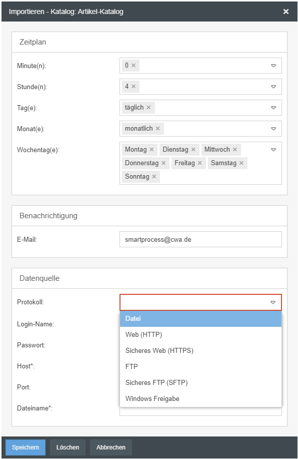Im Bereich Zeitplan legen Sie fest, wie häufig SmartProcess versuchen soll die angegebene Datenquelle abzurufen und den Import ins System durchzuführen. Im Beispiel wird das System versuchen den Import täglich um 4:00 Uhr anzustoßen.