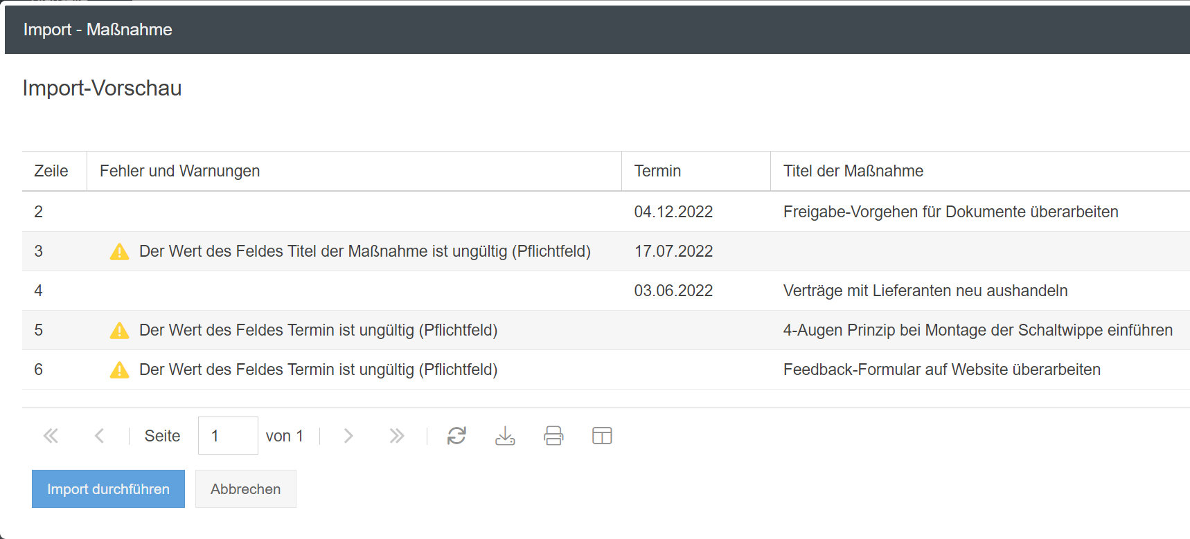 - Rote Warnungen verhindern, dass der Import für diese Zeile durchgeführt wird.