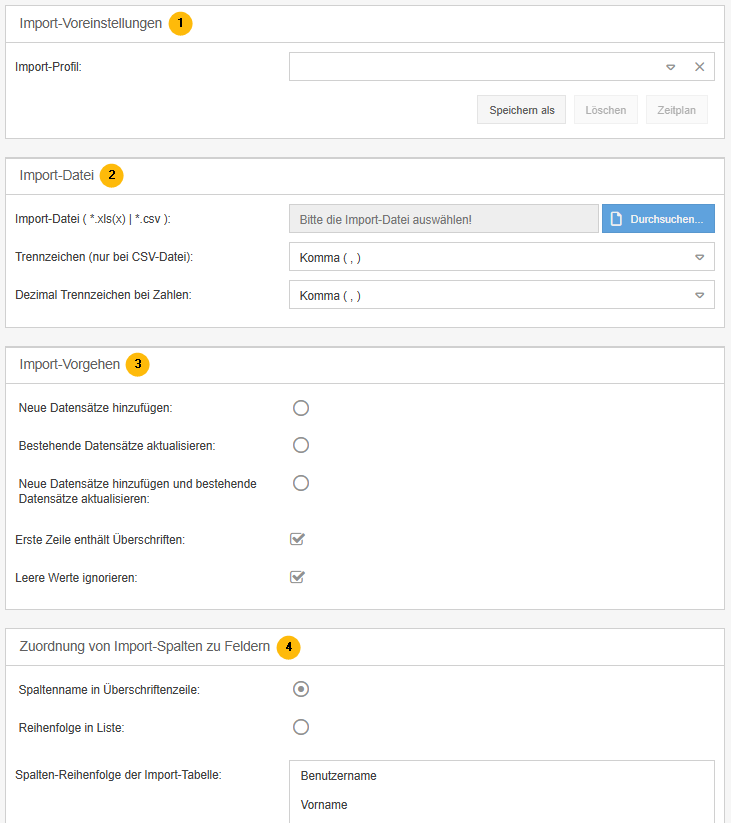 Die Importmaske ist dabei unabhängig vom importierten Inhalt immer ähnlich aufgebaut. Die allgemeingültige Importmaske wird in diesem Artikel beschrieben. Welche Besonderheiten beim Import der jeweiligen Inhalte zu beachten sind, wird in den verlinkten Artikeln beschrieben: