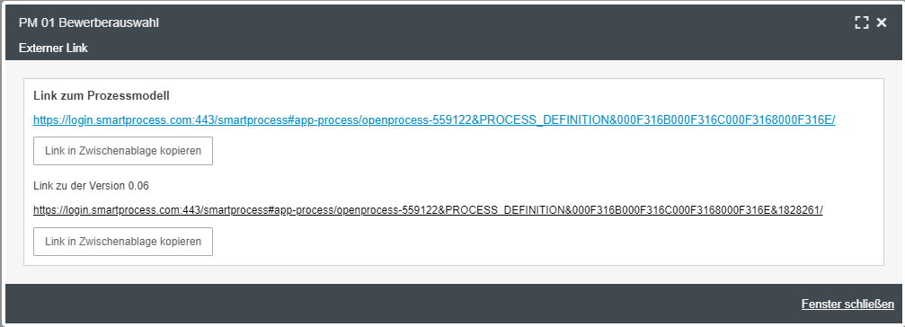 - Link zu der Version <<Versionsnummer>> -> Hierbei handelt es sich um einen statischen Link, der immer zum Prozess in der angezeigten Versionsnummer führt, auch wenn im weiteren Verlauf neuere Versionen des Prozesses erstellt werden.