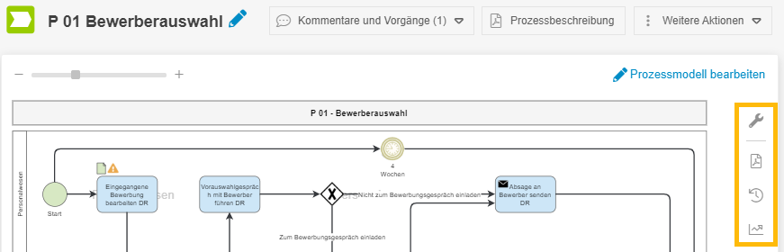 Einige dieser Optionen lassen sich ebenfalls über Mini-Symbole rechts neben dem Prozessmodell aufrufen.