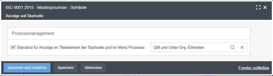 Hier kann entschieden werden, ob die ausgewählte Prozesslandkarte (bzw. allgemein die Prozessgruppe / der Prozess) in dem Titelelement auf der Startseite angezeigt werden soll.