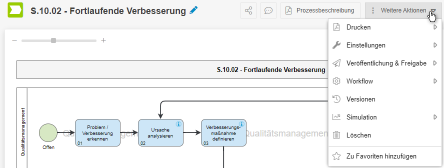 Oberhalb des Prozessmodells können über den Button <Weitere Aktionen> zusätzliche Optionen für den Prozess eingeblendet werden.
