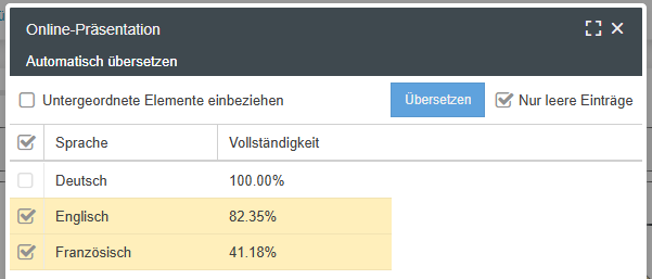 Mit der Auswahl "Nur leere Einträge" kann festgelegt werden, ob bereits übersetzte Felder ignoriert oder automatisch neu übersetzt werden sollen.