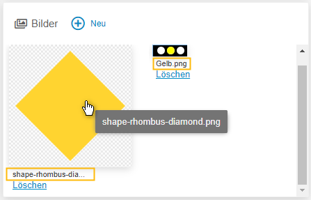 - Wenn Bilder als Anlagen zu einem Vorgang hinzugefügt wurden, wird im Vorgangsfenster im Bereich 'Bilder' der Dateiname mit bis zu 20 Zeichen unterhalb des Bildes angezeigt. Wenn ein Bild mit der Maus gehovert wird, wird der vollständige Dateiname angezeigt.