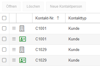 - Menü Kontakte - In der Kontaktauflistung lässt sich anhand eines Symbols schnell erkennen, ob es sich bei dem Kontakt um eine Firma oder eine Kontaktperson handelt.