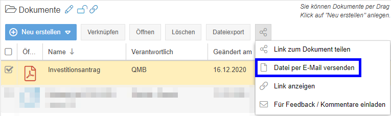 - Datei per E-Mail versenden (nur für Dokumente) -> Bei Dokumenten kann zusätzlich die momentan veröffentlichte Version der Dateianlage per E-Mail versendet werden.