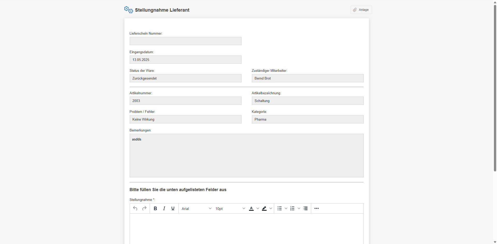 Ein Beispiel für das Senden eines Formulars ist die Stellungnahme des Lieferanten aus der Lieferantenreklamation.