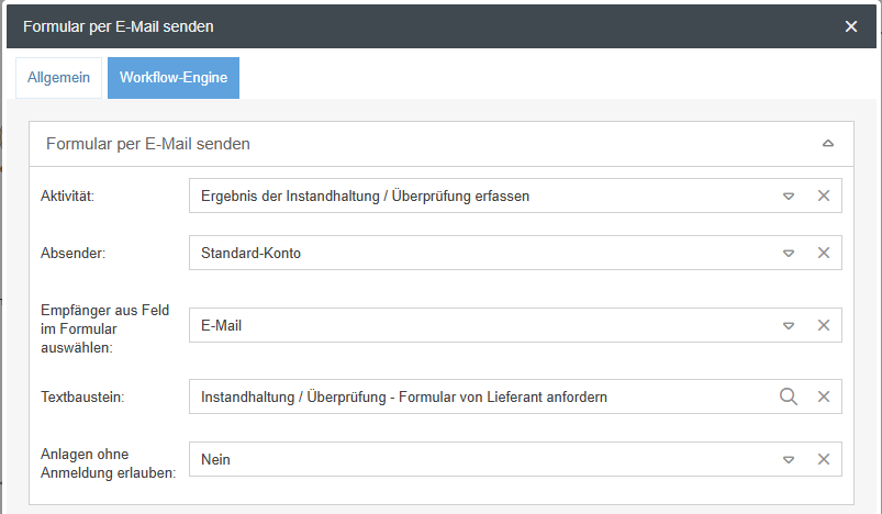 - Aktivität: In der Workflow-Engine kann das zu sendende Formular im Feld "Aktivität" ausgewählt werden. Hierfür muss zunächst eine Aufgabe oder ein Sub-Prozess mit einem Formular angelegt werden, damit eine Aktivität eingetragen werden kann.