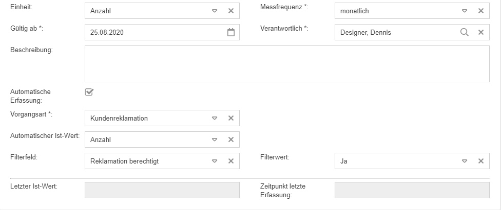 Im Beispiel des Screenshots wird jeden Monat (Messfrequenz) die Anzahl (Automatischer Ist-Wert) neu erstellter Kundenreklamations-Vorgänge (Vorgangsart) erfasst, bei denen in dem Feld "Reklamation berechtigt" (Filterfeld) = Ja (Filterwert) ausgewählt wurde.